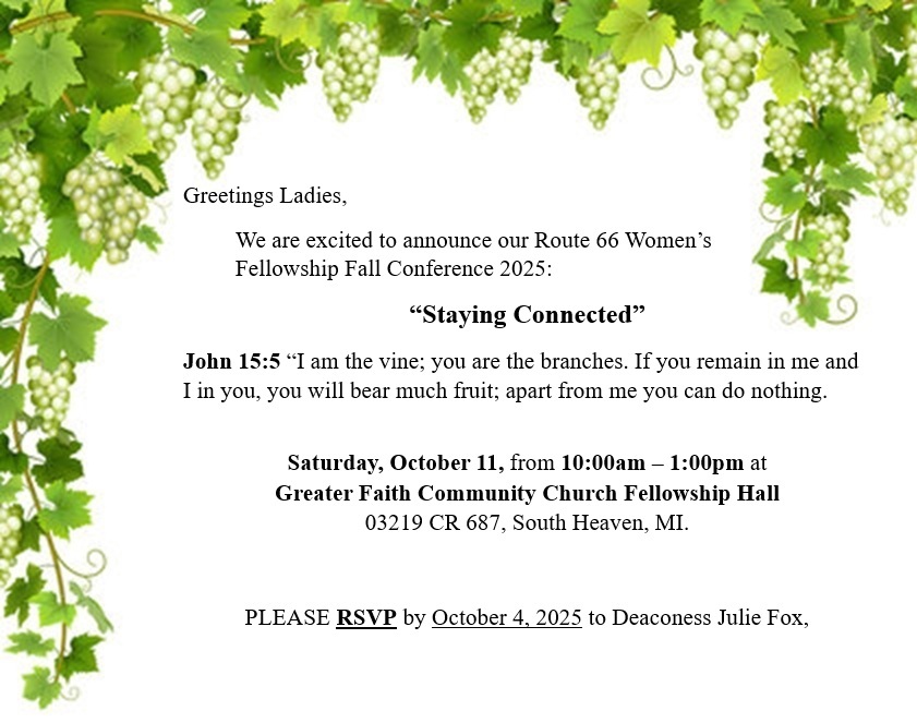 Route 66 Women’s Fellowship https://www.preachsista.org/conference Conference Location: Maranatha Bible & Conference, 4759 Lake Harbor Road, Norton Shores, Michigan 49441 Conference Begins: Thursday, May 7 at 5:30pm and ends Saturday, May 9 at noon. Conference Fees: Keeping it Affordable for twenty-five years! Reserve your spot early and save. Prices will increase in 2026. 2-Night stay, meals, sessions $200 per person, double occupancy (best deal) 1-Night stay, meals, sessions $175 per person, double occupancy No overnight, meals, sessions $120 per person, Friday Only One session, one meal $50 per person Thursday Night Concert only $35 per person